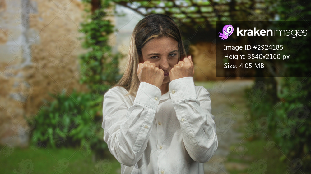 Woman in white shirt standing at building entrance with fists up to face in boxing guard pose, near stone arch and garden path; determination strength. - Kraken Images