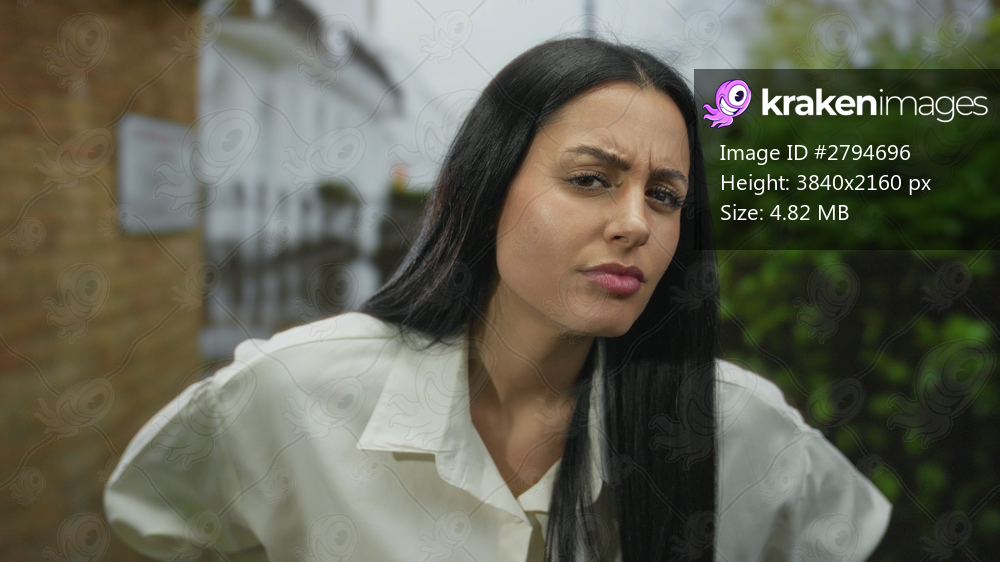 Woman in white shirt standing on outdoor city street with a curious expression surrounded by buildings and greenery.