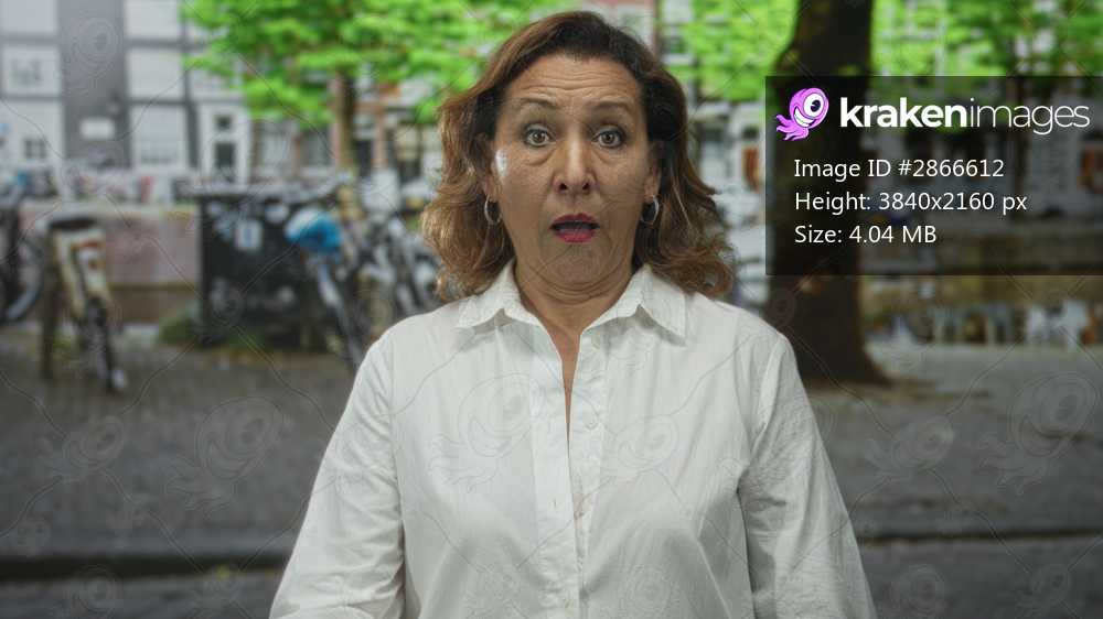 Woman in white shirt standing still clutches chest for heartattack on cobblestone street amid trees; surprise.