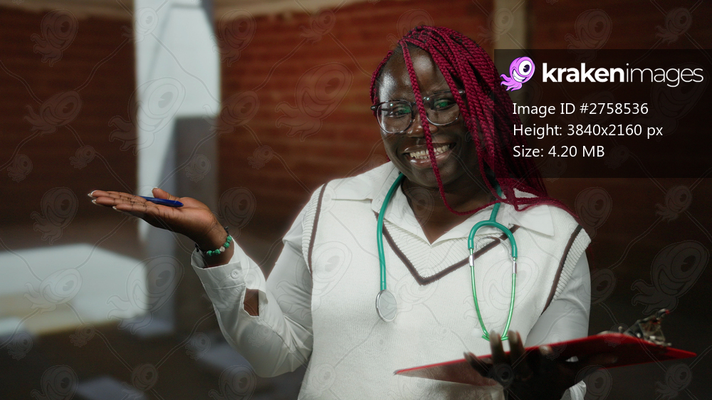 Woman in white shirt with stethoscope smiling at construction site, holding pen and clipboard, showcasing a blend of medicine and architecture in an indoor setting. - Kraken Images