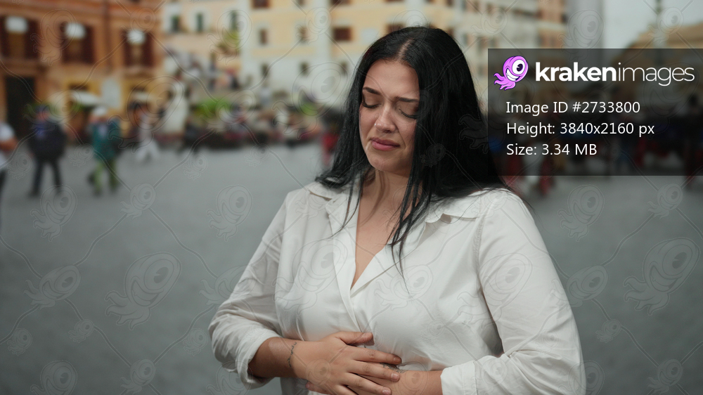Woman in white shirt with stomach pain stands on a busy city street surrounded by blurred pedestrians and buildings under daylight.