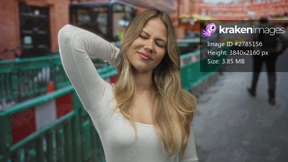 Woman in white shirt wincing as she holds neck on urban construction site; pain discomfort fatigue stress.