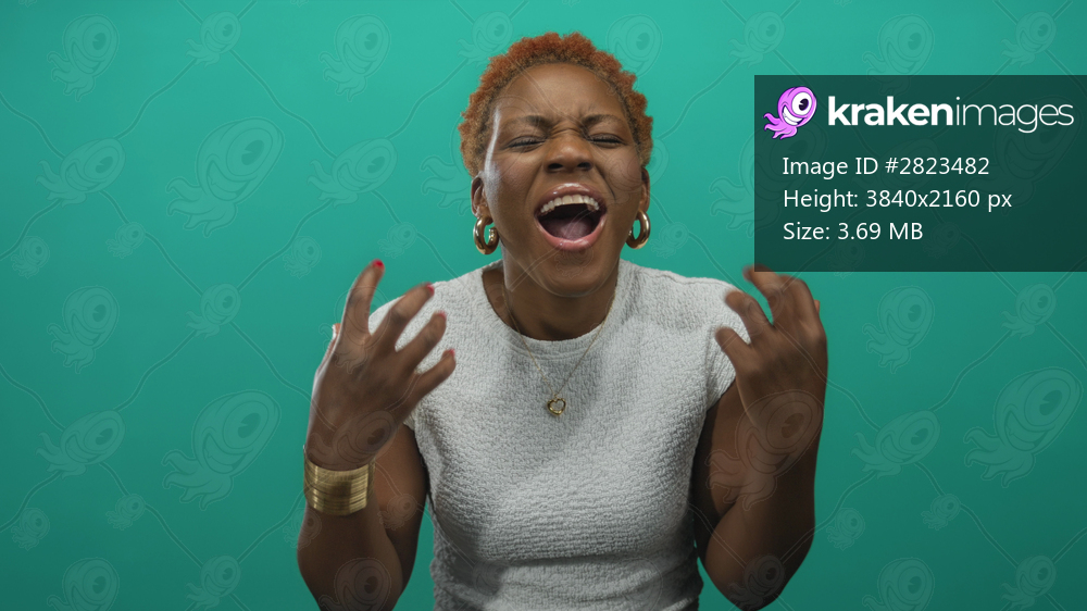 Woman in white sleeveless top with bare hands raised and mouth wide open yelling in green studio; anger frustration.