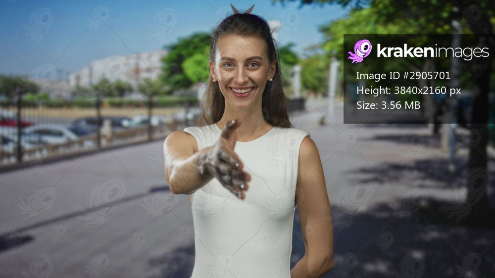 Woman in white sleeveless top hand extended for handshake on street, smiling and reaching forward; friendliness.