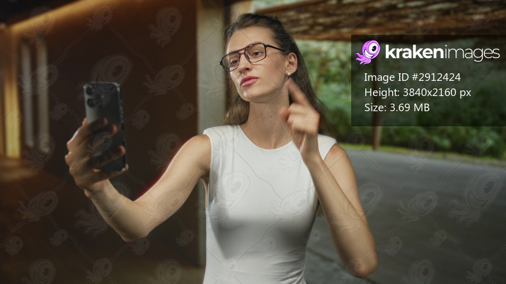 Woman in white sleeveless top holding smartphone at arm length for a selfie in studio with glasses visible and hand on hip; confidence.