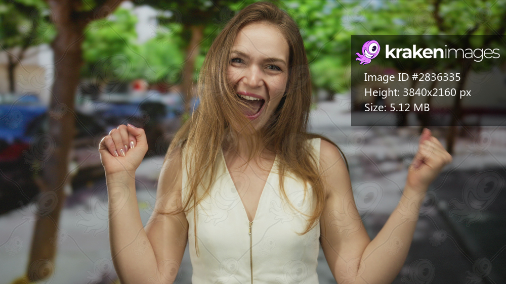 Woman in white sleeveless top smiling broadly and raising clenched fists on a tree lined urban street with parked cars; triumph.