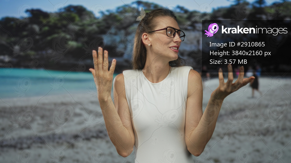 Woman in white sleeveless top smiling with hands open and gesturing at beach shore, wearing glasses and pearl earrings; joy.