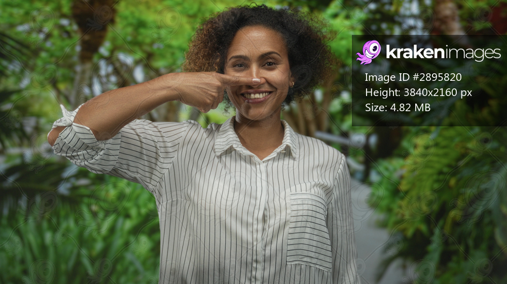 Woman in white striped shirt points finger to nose on park path lined with green foliage, smiling with relaxed posture and friendly expression; playful. - Kraken Images