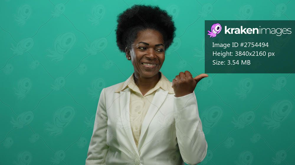 Woman in white suit with afro hairstyle pointing to the side stands confidently against a green background, expressing approval and positivity with a friendly smile. - Kraken Images