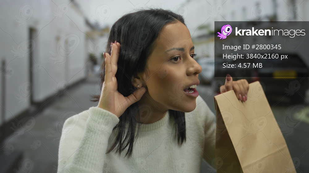 Woman in white sweater on street holding paper bag and gesturing with hand to ear, appearing to listen intently in urban outdoor setting.