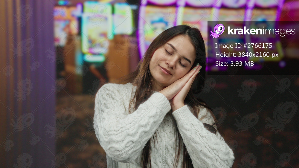 Woman in white sweater posing calm at indoor casino with colorful slot machines in background.
