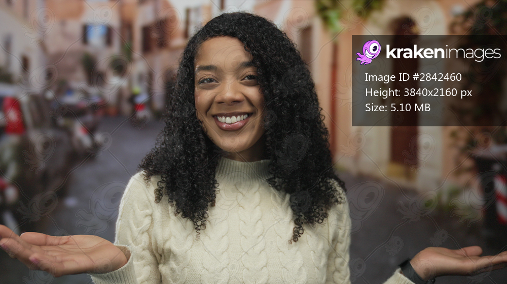 Woman in white sweater smiles and holds open palms up on an old town street lined with buildings; warmth welcome.