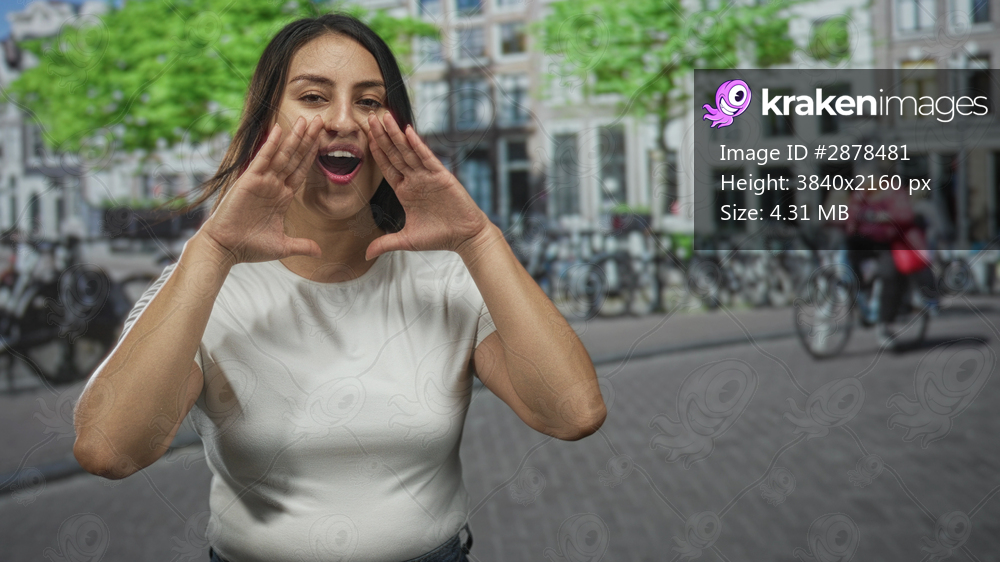 Woman in white t shirt cupped hands shouting toward camera on a city street lined with bicycles; joy celebration call.