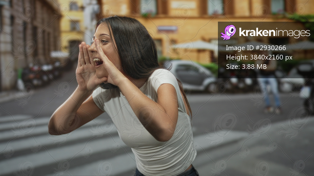 Woman in white t shirt cupping hands to mouth and shouting on street crosswalk; youthful excitement.