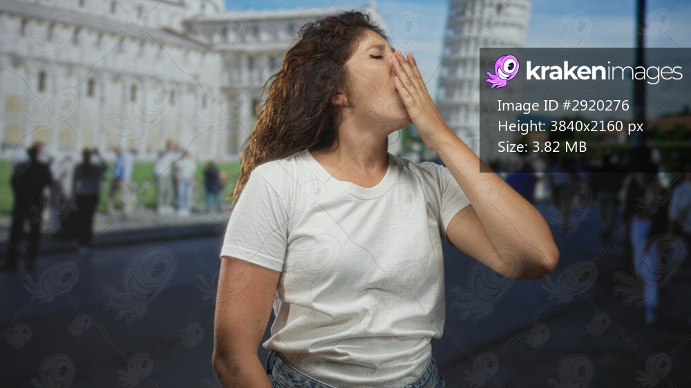 Woman in white t shirt with hand to hair and eyes closed by building near pisa tower, smiling softly under daylight; travel joy.