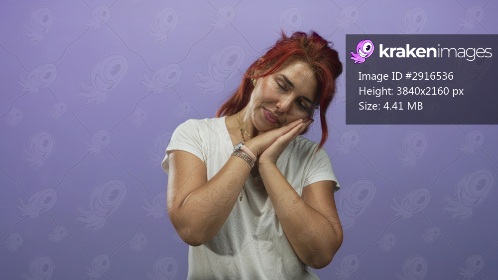 Woman in white t shirt with hands clasped to cheek and closed eyes posing as if sleeping in purple studio, relaxed posture and visible jewelry; calm rest. - Kraken Images