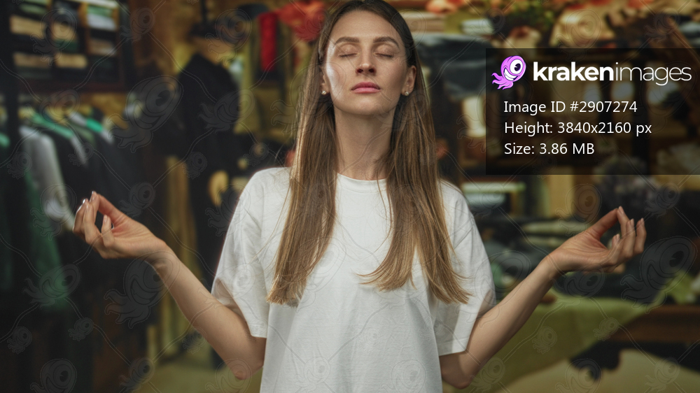Woman in white t shirt with hands in meditation mudra and closed eyes inside a building clothing shop aisle; mindfulness serenity.