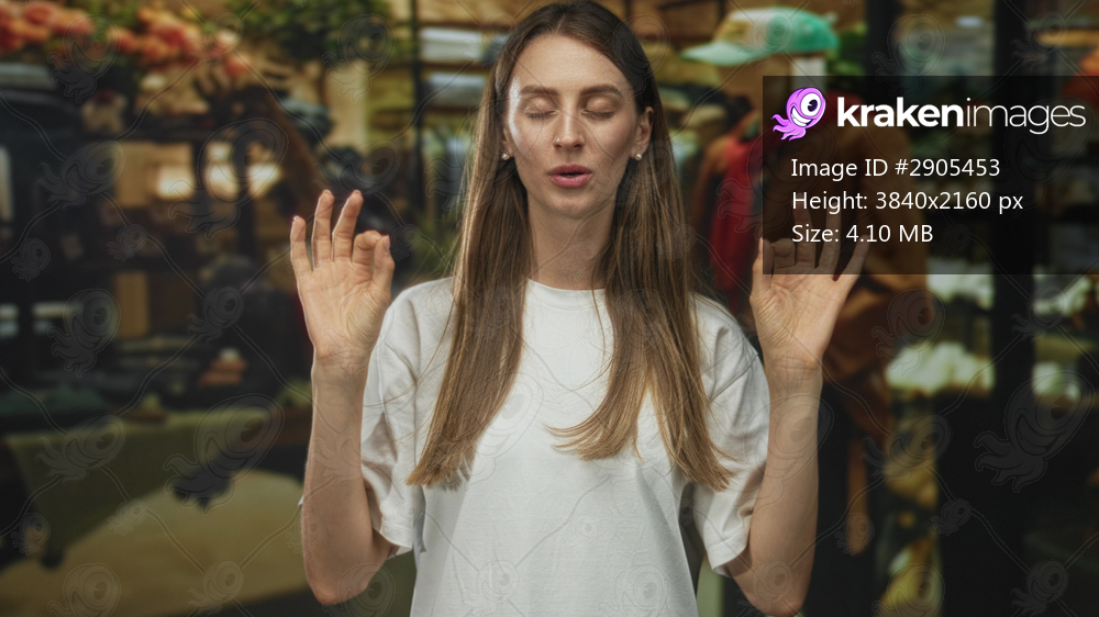 Woman in white t shirt with hands in meditation pose and closed eyes inside a retail building with mannequins and clothing racks; serenity.
