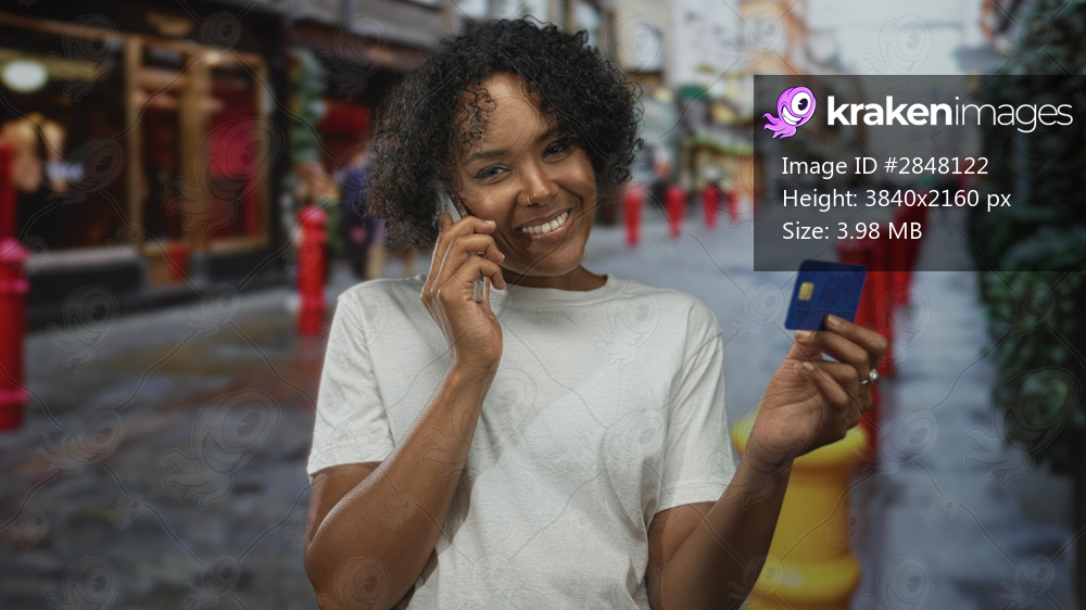 Woman in white t-shirt holding blue creditcard on busy city street; consumer financial empowerment optimism.