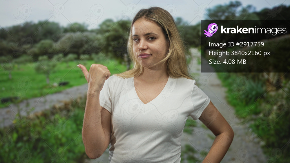 Woman in white t shirt points thumb to a gravel path in countryside while winking one eye and hand on hip; dismissal.