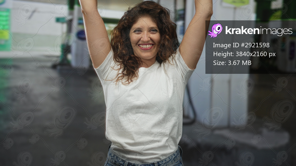 Woman in white t shirt raising arms and smiling with clenched fists at petrol station forecourt by fuel pumps and columns; joy victory celebration.