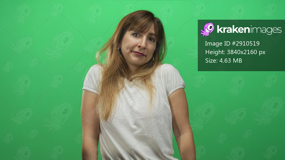 Woman in white t shirt shrugs shoulders and tilts head, showing bare forearms in studio against vivid green screen; uncertainty.