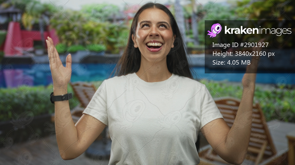 Woman in white t shirt smiling widely and raising a clenched fist beside a resort pool building with lounge chairs and plants visible; joy celebration. - Kraken Images