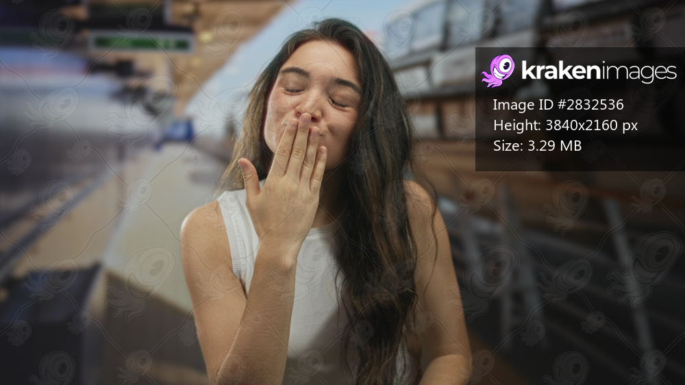 Woman in white tank top blowing kiss with hand at lips on sunlit boat deck at sea with long hair flowing in breeze; affection.
