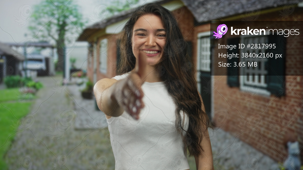 Woman in white tank top extends hand for handshake in front of red brick building with smiling face; greeting trust.