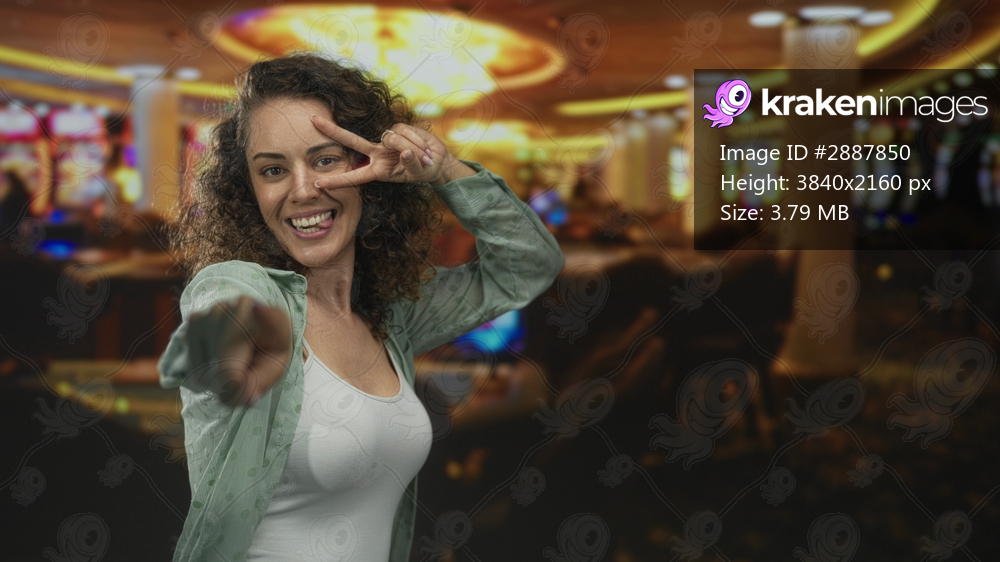 Woman in white tank top points finger at camera while making a v sign near eye and smiling in casino; playful joy.