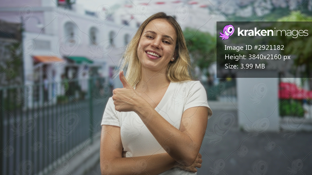 Woman in white tee showing thumbs up with arm across chest on street near railing; confidence approval optimism.