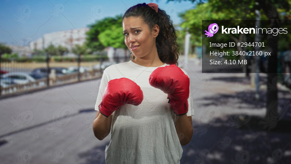 Woman in white tee wearing red boxing gloves holds fists up on urban street with wary smile and guarded stance; determination resilience.