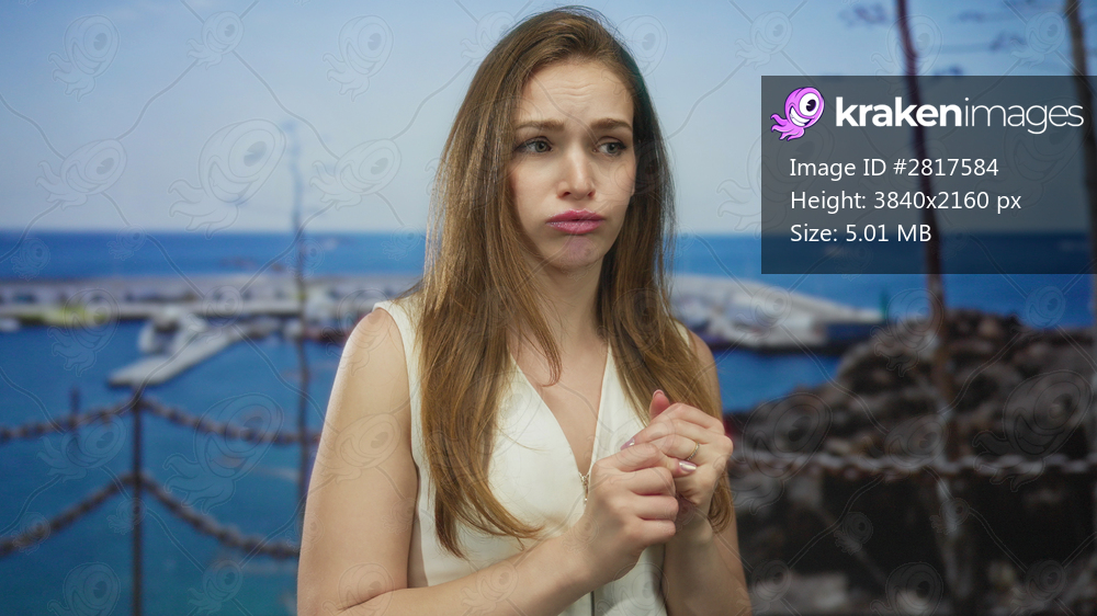 Woman in white top adjusts fingernails and fidgets fingers at a sunny port dock; anxiety and uncertainty.