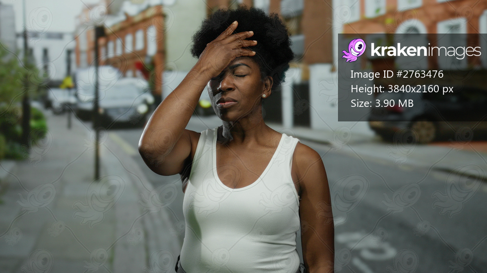 Woman in white top appears stressed while holding forehead on an urban street during the day surrounded by traffic and buildings illustrating a busy city lifestyle. - Kraken Images