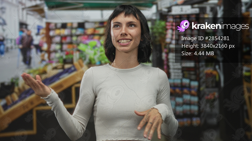 Woman in white top holds open palms with arms outstretched beside produce stand inside building; joy.