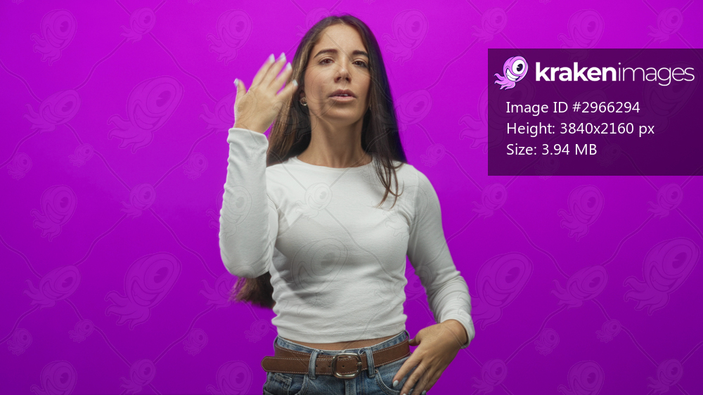 Woman in white top and jeans brings hand to mouth and blows a kiss against a purple studio backdrop; playful confidence.