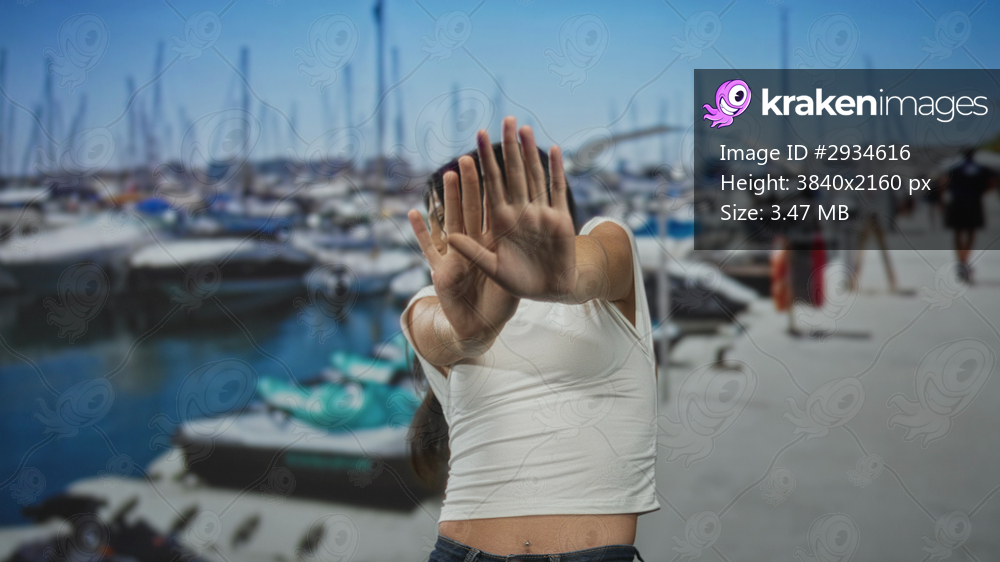 Woman in white top and jeans with hands raised blocking face on street by boats and dock pier; shyness privacy reluctance.