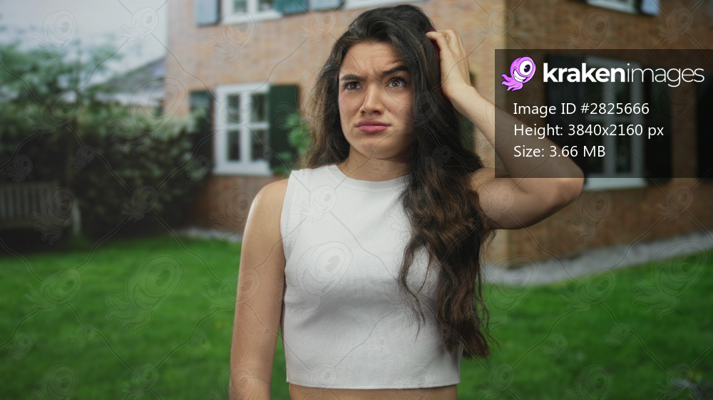 Woman in white top touching her forehead and placing one hand on her hip in front of a brick building outdoors; thinking.