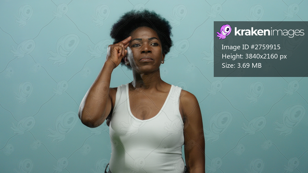 Woman in white touching forehead with finger against blue backdrop conveys thought on isolated background.