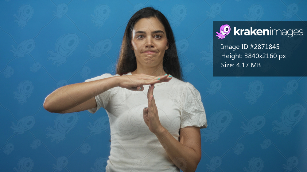Woman in white tshirt with bare arms and hands forming timeout gesture in studio scene; pause calm rest.