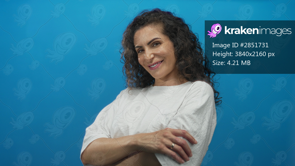 Woman in white tshirt crosses arms and smiles with curly hair in blue studio; confidence empowerment.