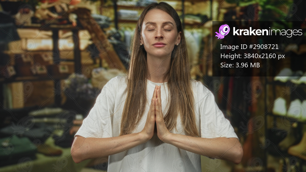 Woman in white tshirt with hands pressed together in prayer inside a retail building, eyes closed at a shop aisle; mindfulness calmness serenity.