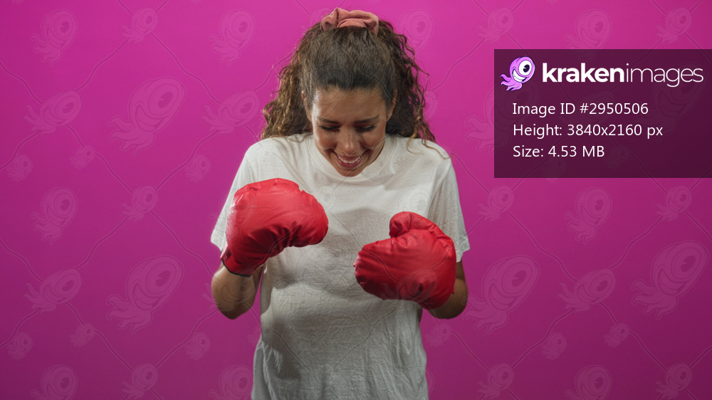 Woman in white tshirt holding red boxing gloves laughing and posing in a magenta studio; playful joy.
