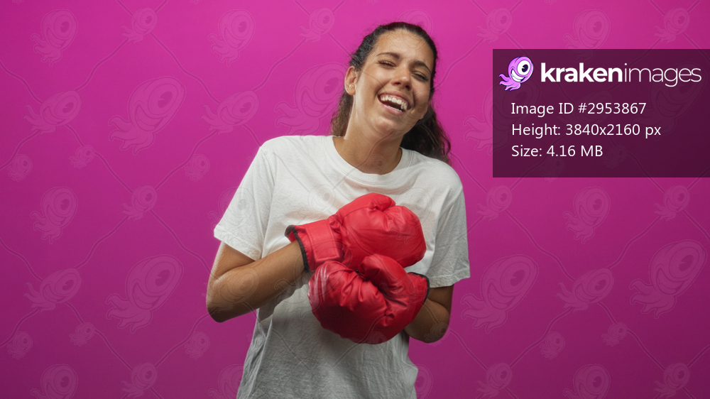Woman in white tshirt holding red boxing gloves laughing and posing in a magenta studio; playful joy.