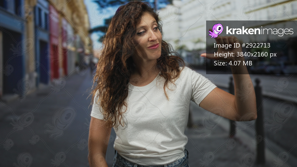 Woman in white tshirt holding thumb and index finger close to indicate small size on street; confidence casual everyday.
