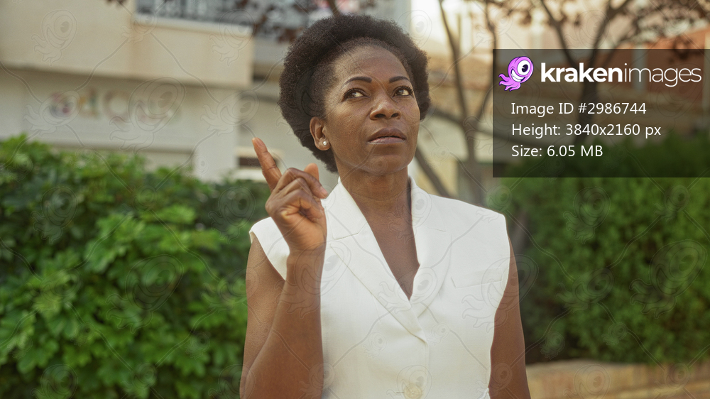 Woman in white vest with finger to chin and raised index pointing on street by building and green hedge, looking pensive; thoughtful reflection contemplation. - Kraken Images