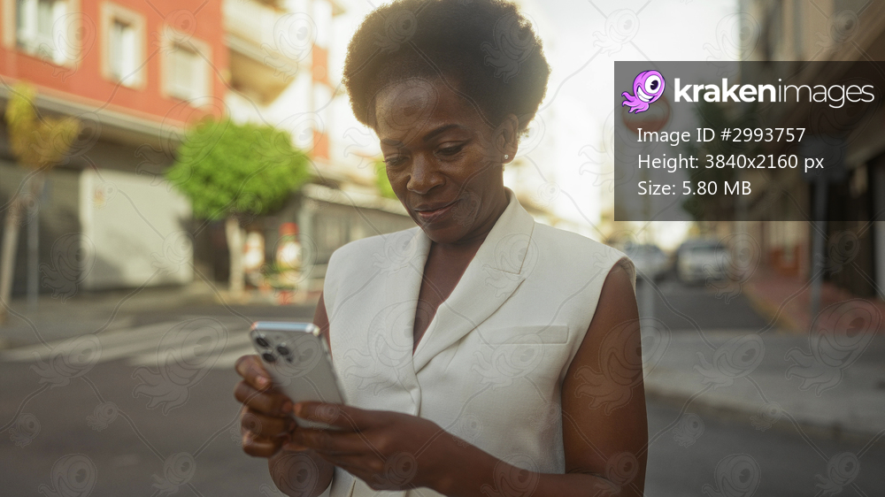 Woman in white vest holds smartphone and looks at the screen while standing on a city street crosswalk; urban routine focused.
