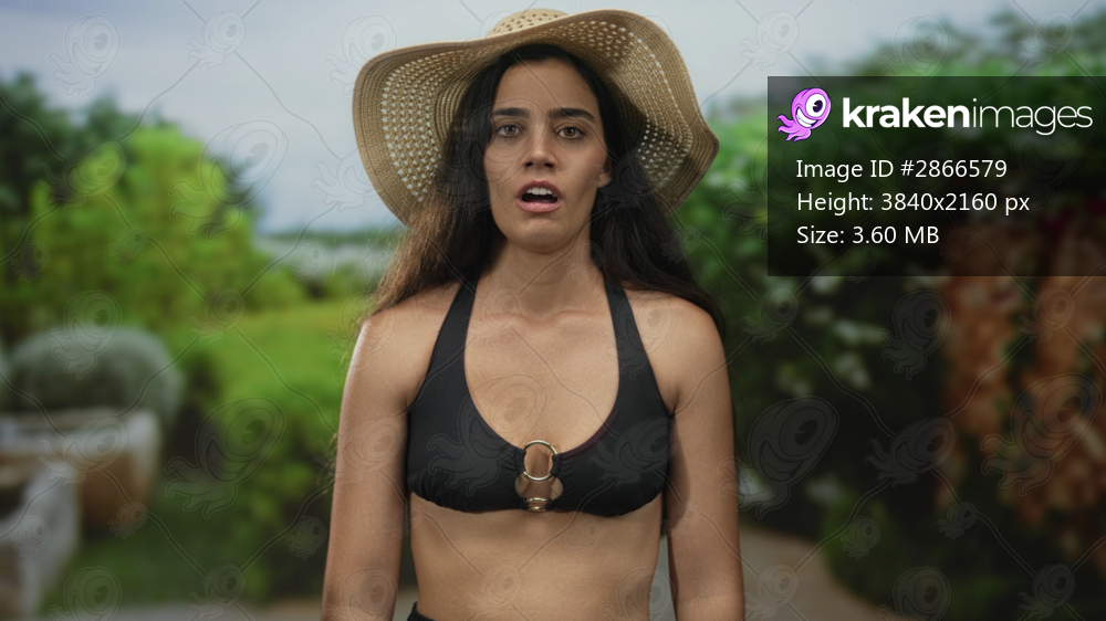 Woman in wide straw sun hat and black bikini top showing bare shoulders in forest path, frowning with downcast gaze and pursed lips; boredom.