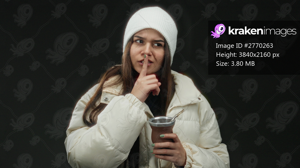 Woman in winter attire holding mate making a shushing gesture against a black background showcasing warmth and mystery.