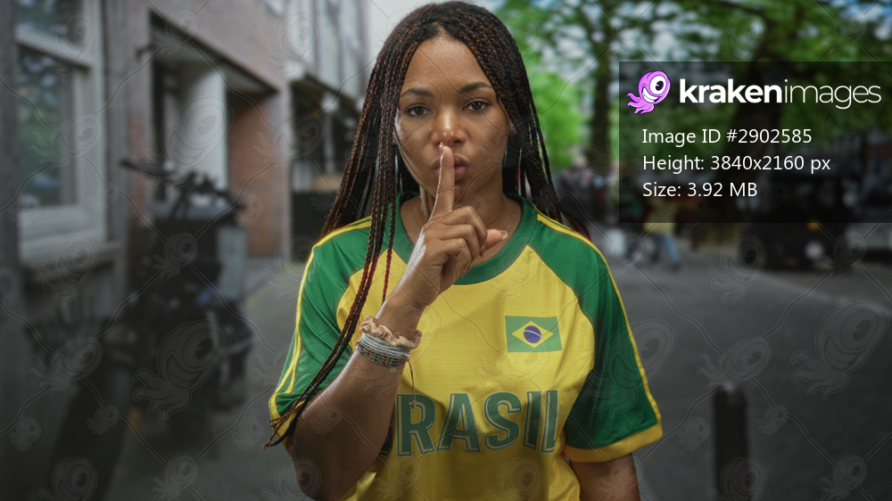 Woman in yellow brazil jersey holds finger to lips for silence on a street with trees and buildings; determination.